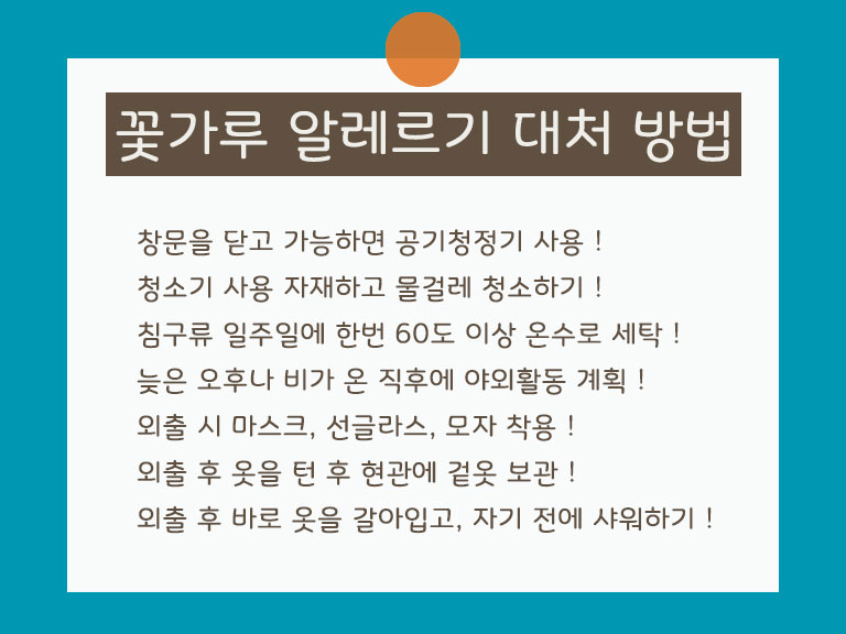 외출 후 집안으로 들어가기 전에 옷을 건조기로 턴다던지 하여 꽃가루를 집안으로 들이지 않도록 합니다.
