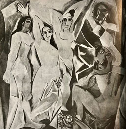 20세기 미술의 시작을 알리는 <아비뇽의 처녀들>은 거대한 화폭 안에 여자 다섯 명이 그려져 있습니다. 네 여자들은 서 있고 한 여자는 앉아 있습니다. 그런데 그 여자들은 익히 보아왔던 그림들 속 여자의 모습이 아닙니다. 그때까지 화가들의 화폭 속 여인들은 항상 아름다웠습니다. 그러나 이 여인들은 아름답지가 않고 보기에도 이상합니다. 세상에 그런 여자의 모습은 존재하지 않습니다. 큰 눈, 정면의 모습에 담긴 옆모습의 코, 오른쪽 여자들의 모가 난 얼굴, 엄청나게 큰 발, 도무지 정상적인 모습이 아닙니다. 그런데도 여자의 얼굴은 정면입니다. 여자들의 육체는 분해되어 있습니다. 이 그림은 한 화면에 둘 이상의 시점이 동시에 들어간 것입니다. 피카소는 이렇게 말했습니다. "삐뚤어진 코, 나는 일부러 그렇게 만들었다, 나는 사람들이 코를 보지 않을 수 없도록 했다." 바로 그 해에 큐비즘이 시작되었고, 현대 미술도 시작된 것입니다. <아비뇽의 처녀들>은 현대회화의 첫걸음을 알리는 신호탄이 되었습니다.